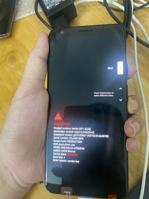 1.Tắt nguồn điện thoại, giữ Nguồn + Volume trừ cho máy vào fastboot (như hình bên dưới)