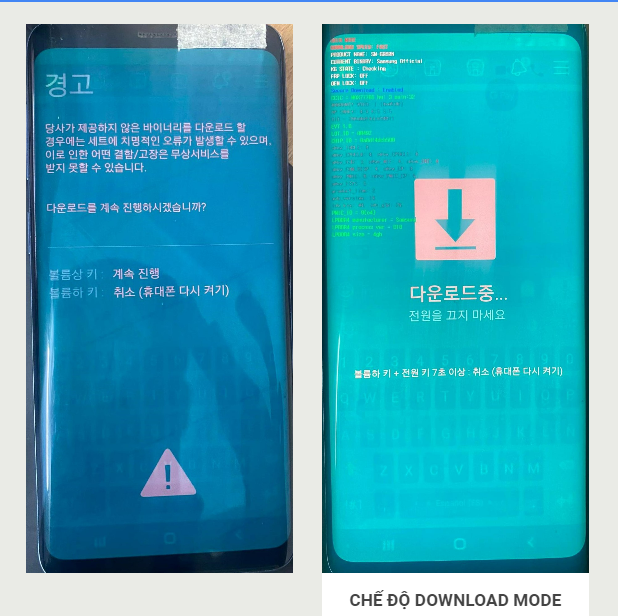 Nhấn Volume Cộng để vào chế độ DOWNLOAD MODE (HÌNH PHẢI)