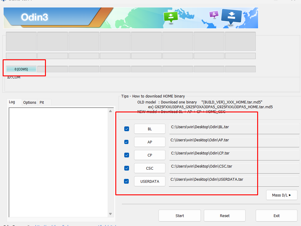 Trỏ lần lượt tương ứng các file BL, AP, CP, CSC, USERDATA trong folder cài ROM (lưu ý giải nén file cài ROM ra rồi trỏ)